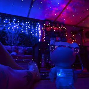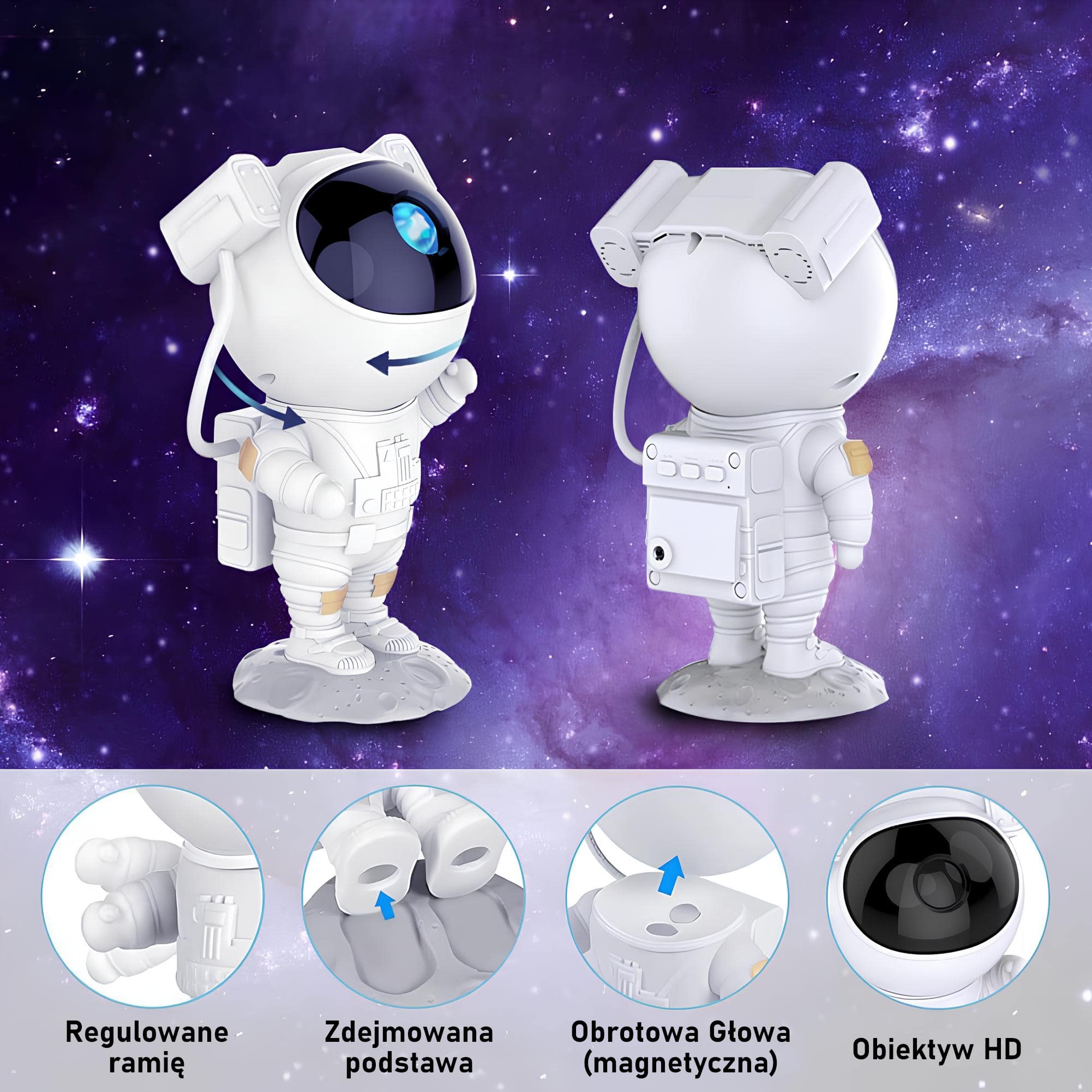 - Nowoczesny design: Kosmiczny Projektor to gwarancja funkcjonalności na najwyższym poziomie. Dzięki głowie astronauty, która oferuje pełny obrót o 360°, łatwo dostosujesz kąt nachylenia projekcji do swoich indywidualnych potrzeb.